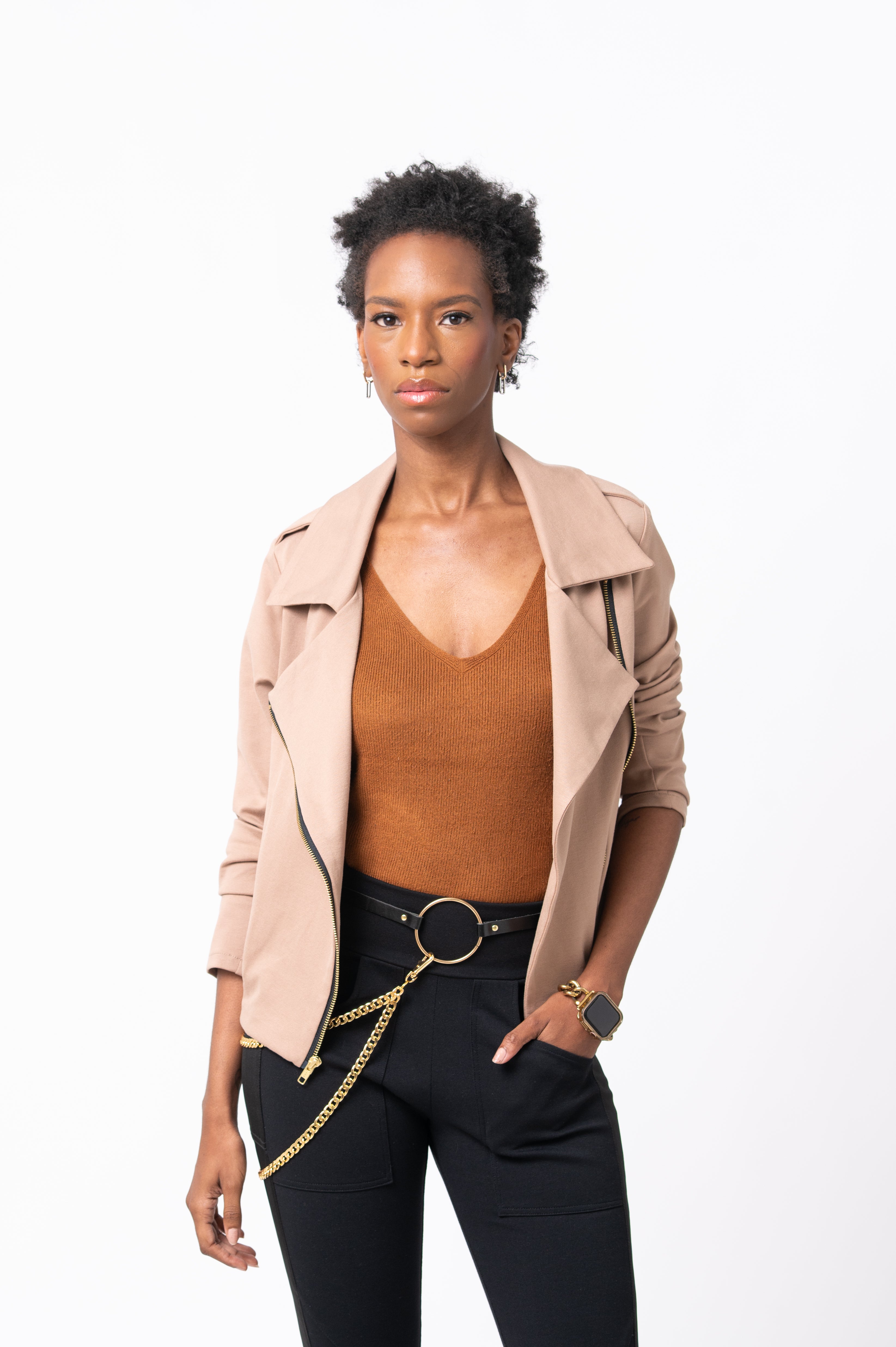 Our Elevated Moto Jacket in Citron is a luxe reinterpretation of the classic, made from heavyweight Italian Papilio Ponte for a sleeker, warmer, and more refined feel. The Citron color features accents of Italian silk faille, while the Black, Mushroom, and Hunter Green versions include coordinating satin accents for a smooth, elegant finish.